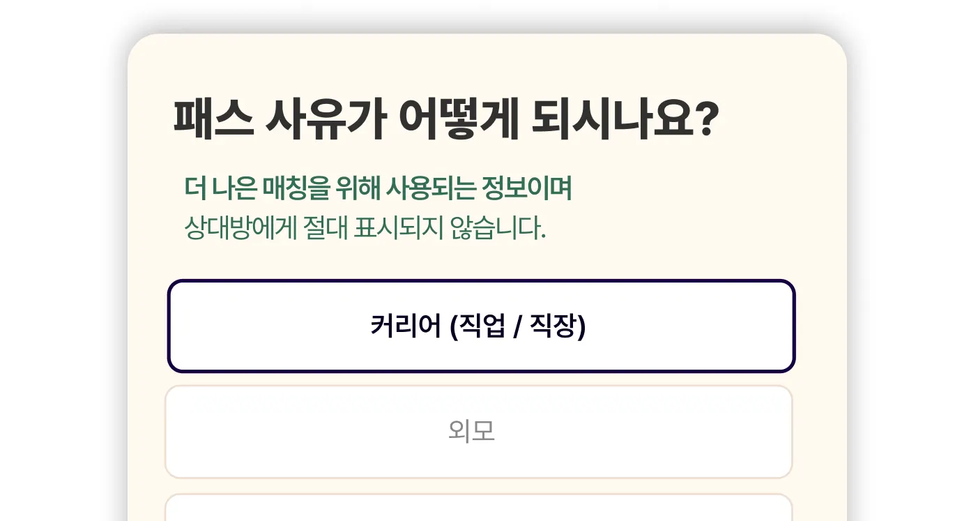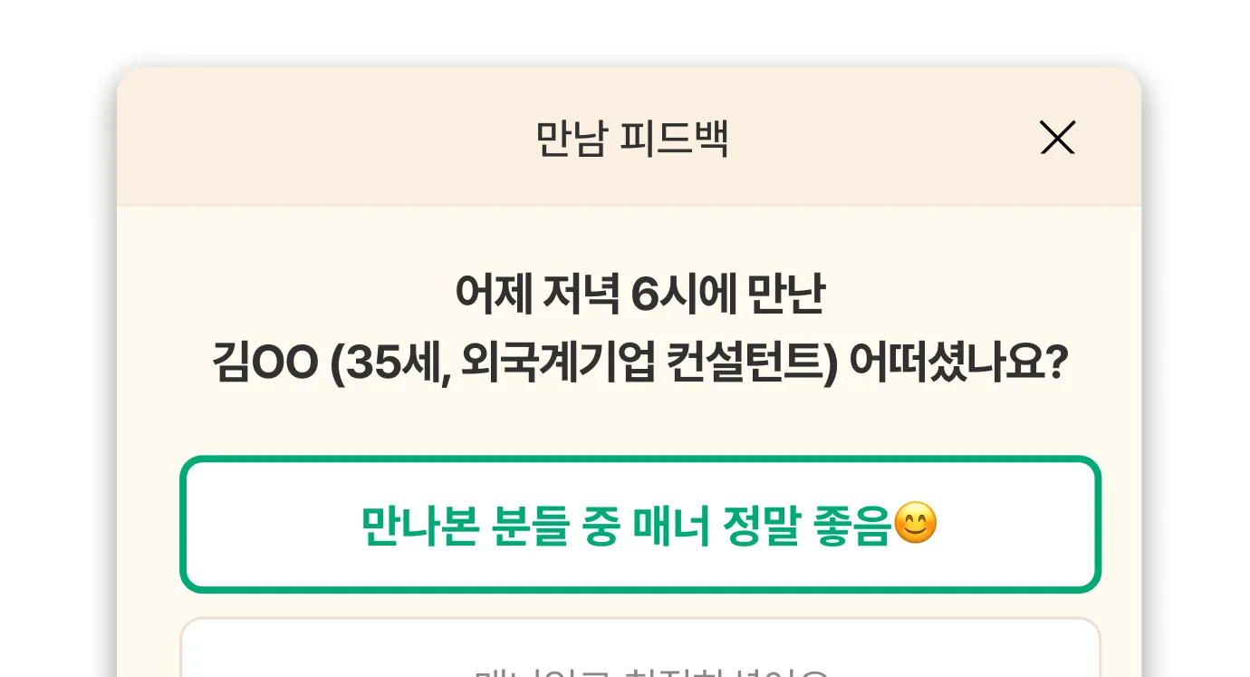 전 편한 시스템이 잘 맞았는데, 또 반대로 생각하면 양날의 검이네요. 근데 저는 미리 연락할 수 없는 구조가 오히려 시간 아낄 수 있어서 좋았고 퍼스널스토리로 대체된 느낌을 받아서 낫배드.