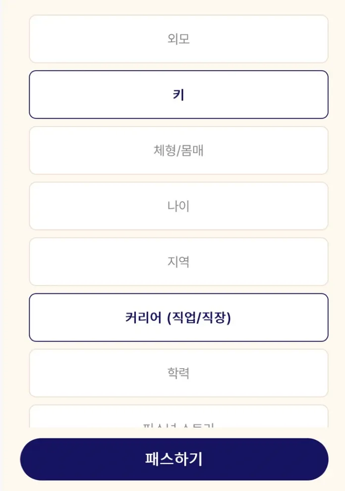 이왕 시작한거 이래저래 효율적으로 소개받고 싶어서 매니저님이 골라준 프로필 [패스사유] 요고를 엄청 솔직하고 디테일하게 선택했던 것 같네요..^^!!